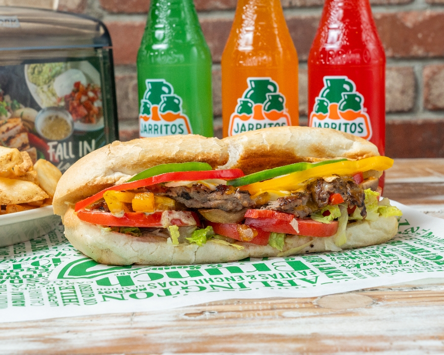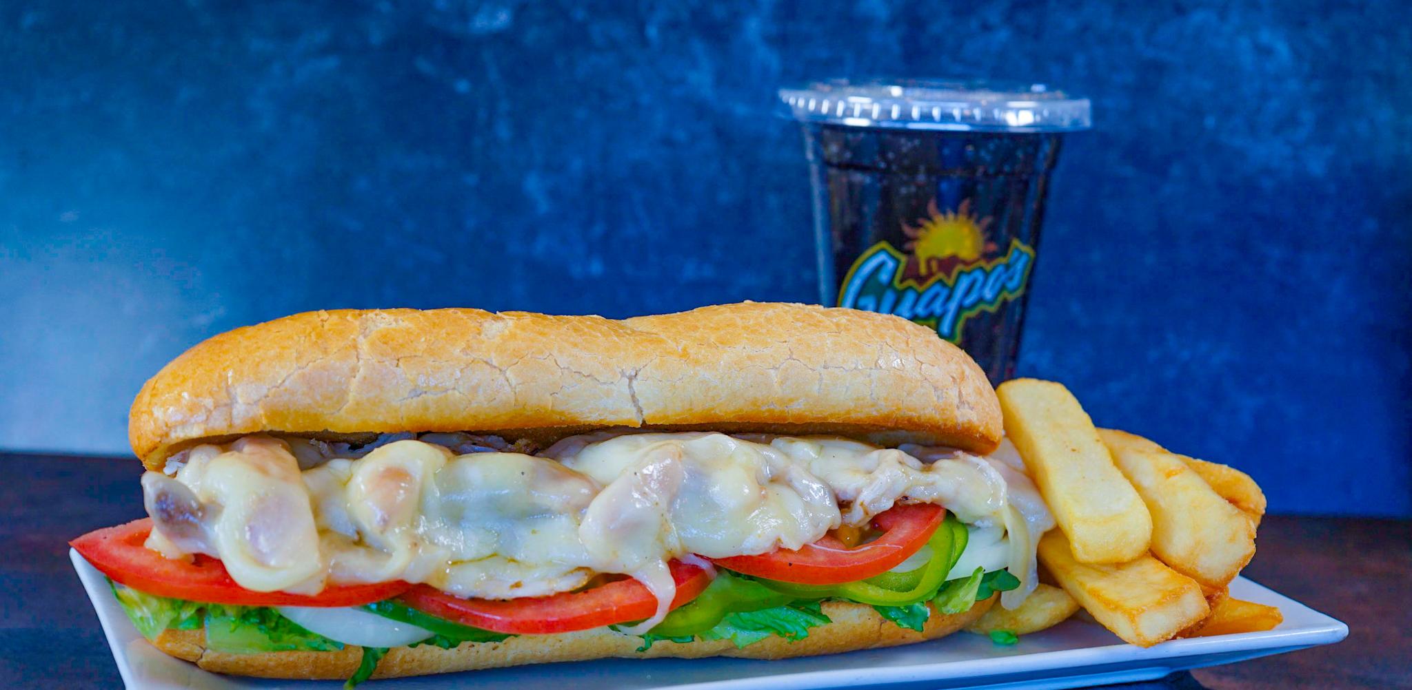 Steak sandwich served with tomatoes, onions, green peppers, mushroom, lettuce, cheese, guapo's salsa, fries and soft drink.