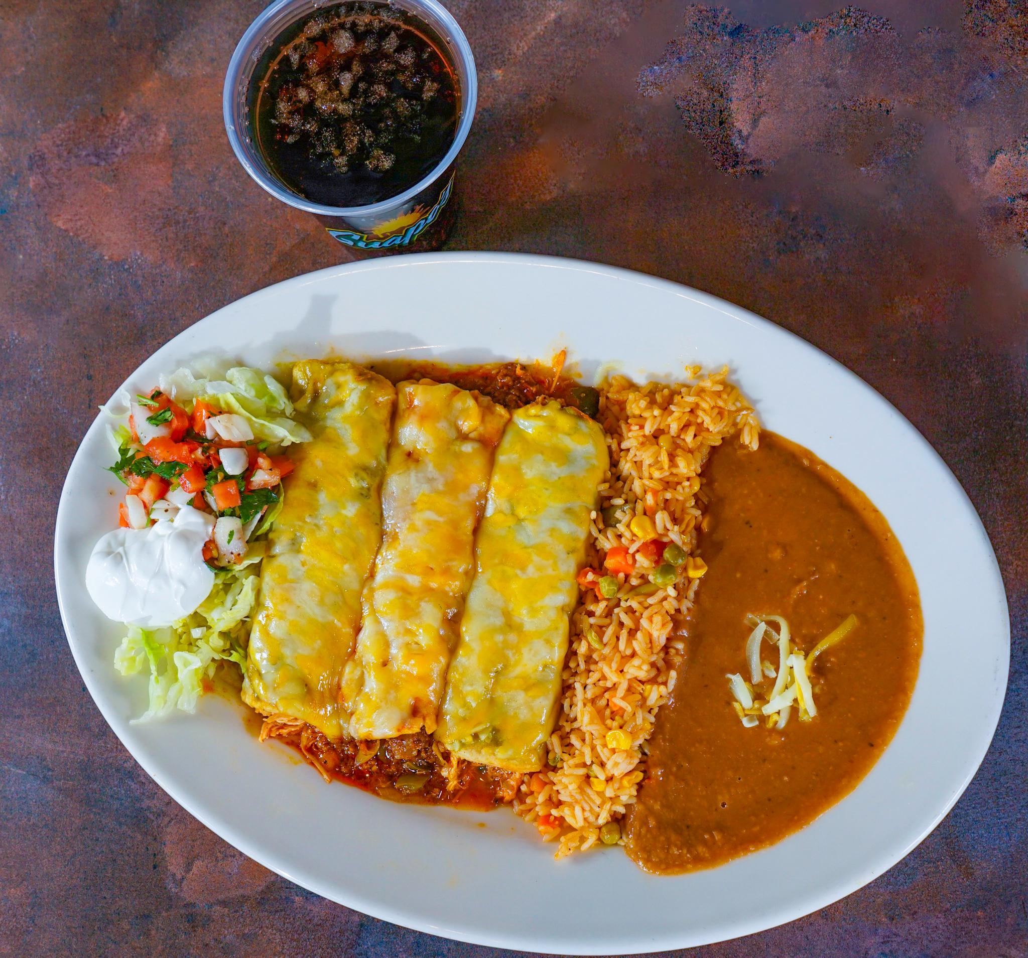 A combination of chicken, beef, and cheese enchilada served with rice, beans, pico de gallo, sour cream and soft drink.