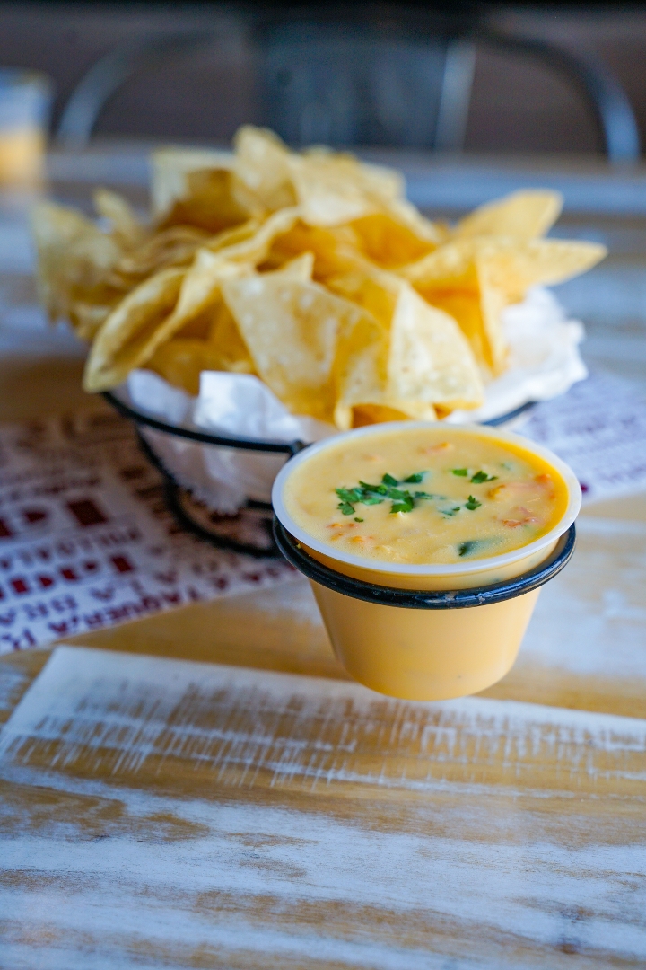 8 oz of chile con queso with seasoned ground beef and beans, topped with chopped onions and sour cream. served with corn tortilla chips.