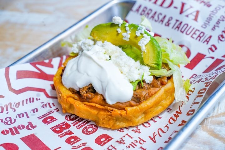 Single fried corn tortilla with refried beans, lettuce, cheese, and avocado. topped with your choice of protein