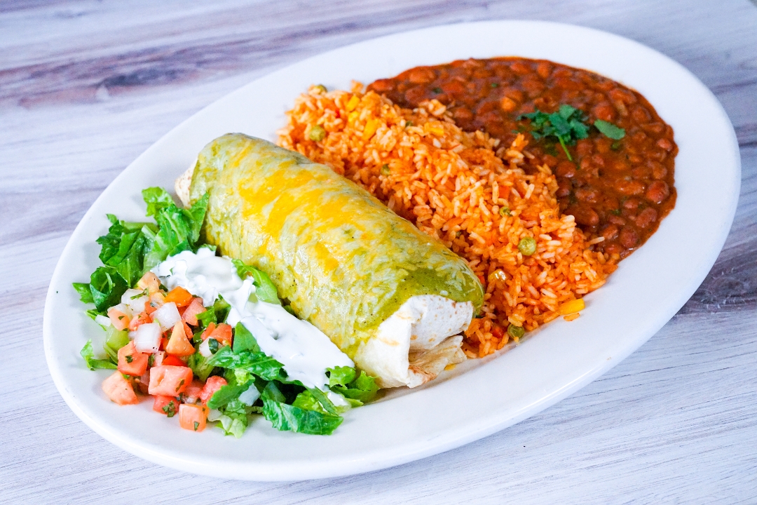 Large flour tortilla rolled with your choice of protein and covered with sauce and melted cheese. served with mexican rice, refried beans, lettuce, pico de gallo, and sour cream.