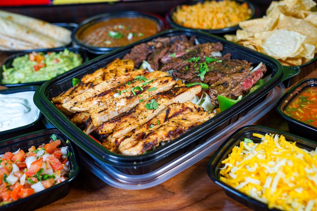 One (1) rotisserie chicken, grilled pork ribs, and steak fajitas with four (4) sides of your choice.