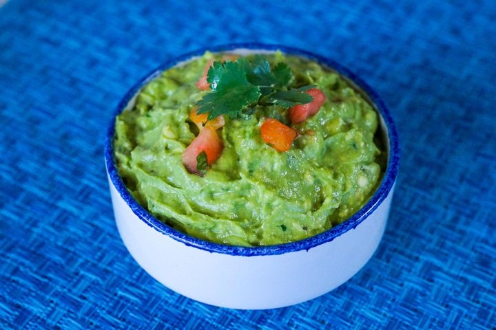 Freshly made guacamole with avocado, jalapeno, tomatoes, lime, onions, and cilantro served with corn tortilla chips.