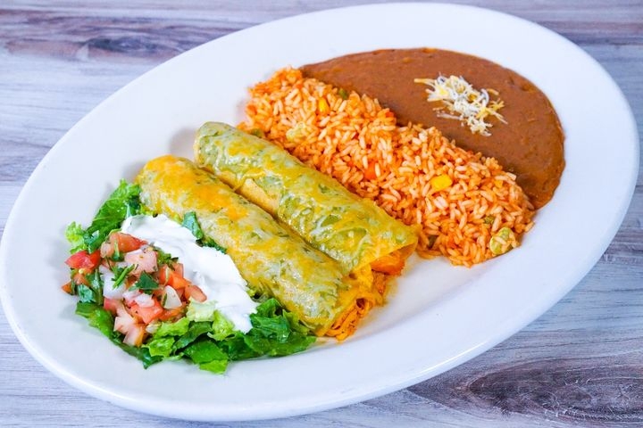 Include Cheese, Chicken or Beef Enchiladas served with Rice, ala Charra beans, Lettuce, sourcream and Pico de Gallo, and Chips and Salsa. Serves 4.