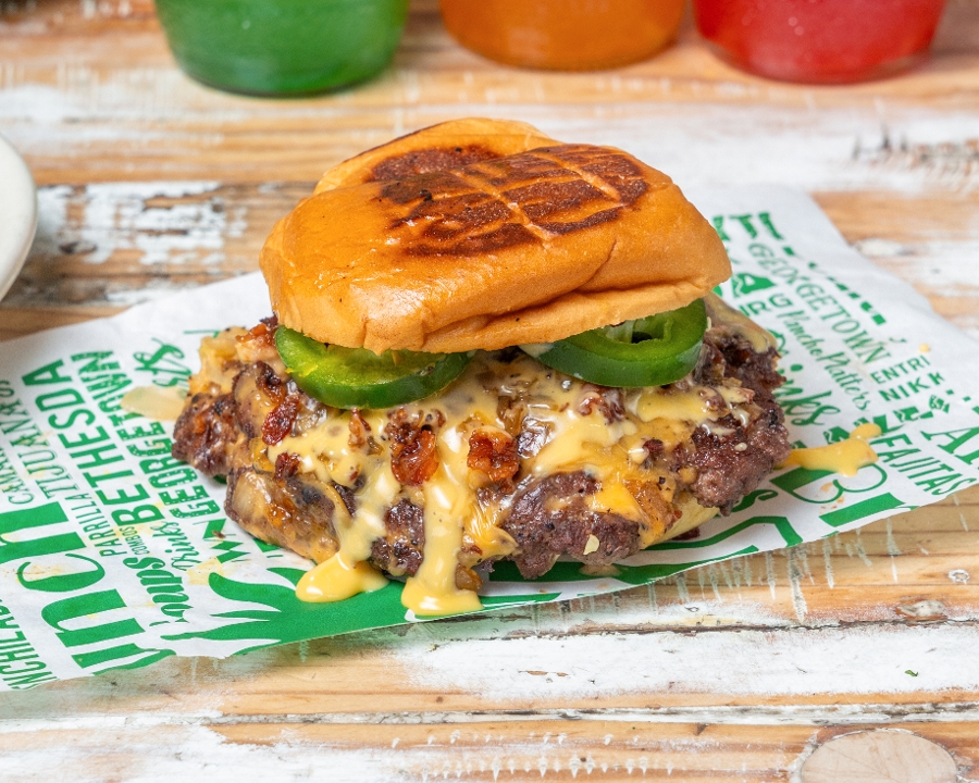 Double patty, 100% fresh beef burger with american cheese, grilled onions, bacon jam, pickles and house sauce on a martin's potato bun. make it spicy with jalapenos.