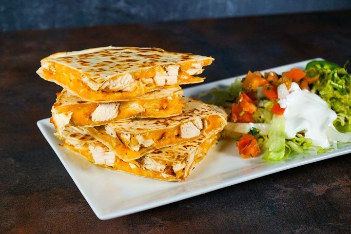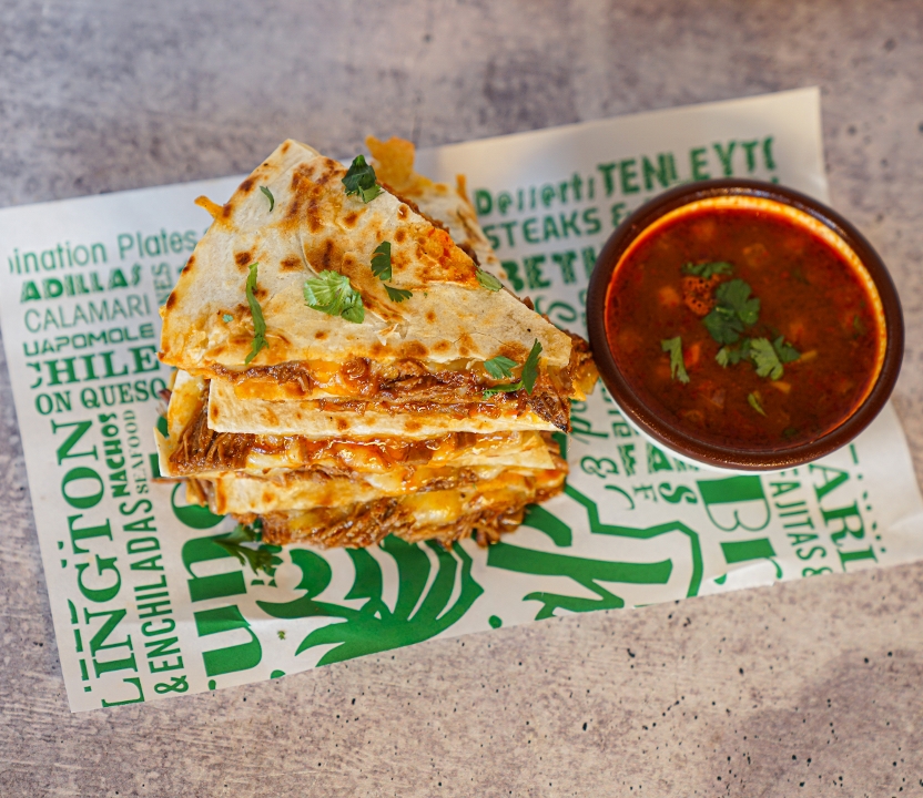 Two fresh flour tortillas stuffed with monterey jack and cheddar cheese. served with lettuce, pico de gallo and sour cream.