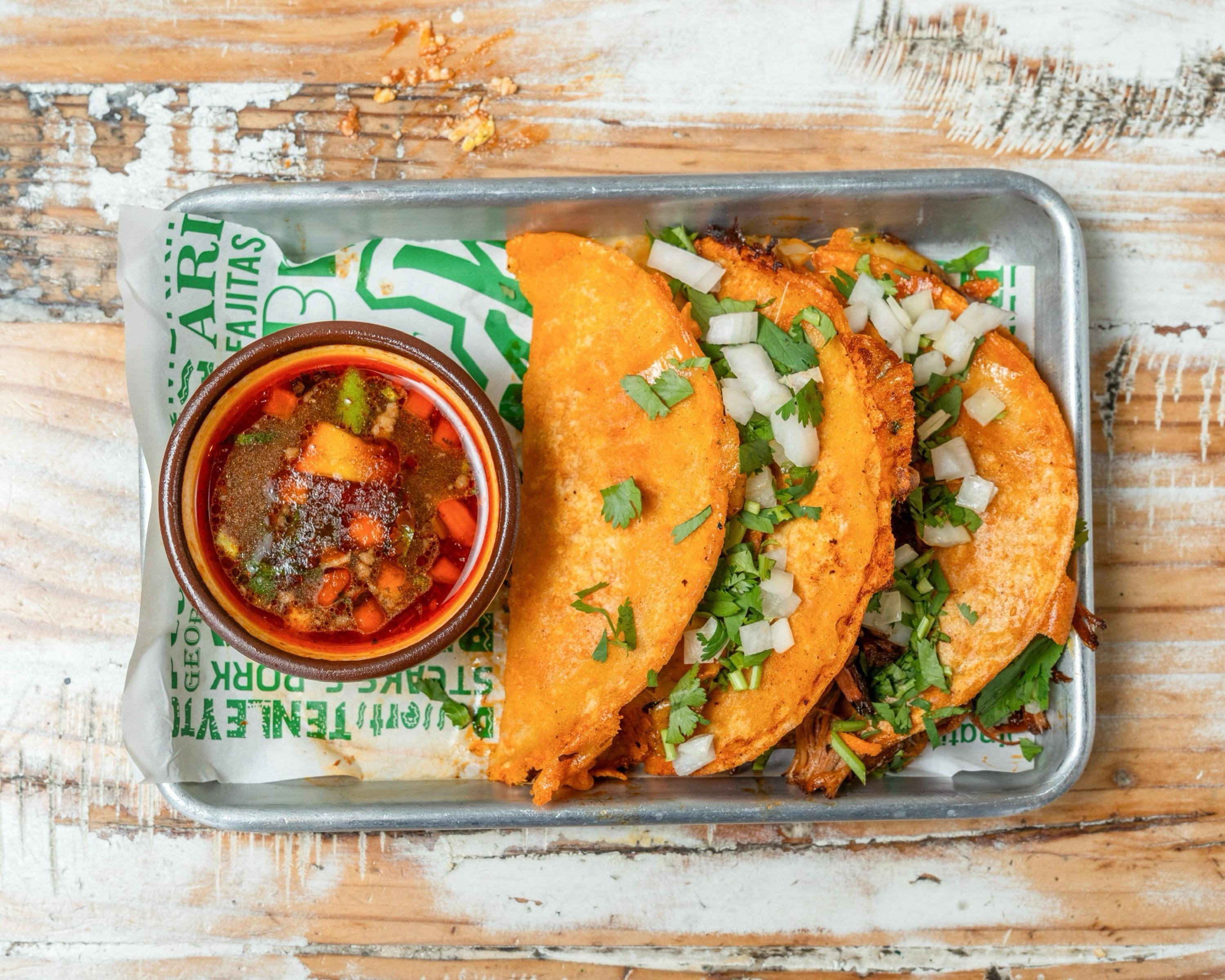 Three corn tortillas filled with beef birria. topped with onion & cilantro mix. served with broth consome.
