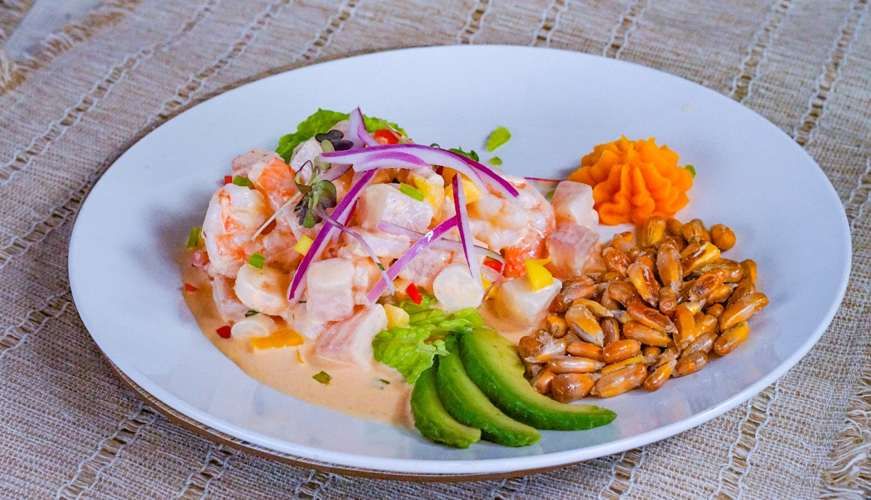 Marinated fish, shrimp and octopus in a touch of yellow pepper cream and fresh lime juice mixed with cilantro and arequipa onions.