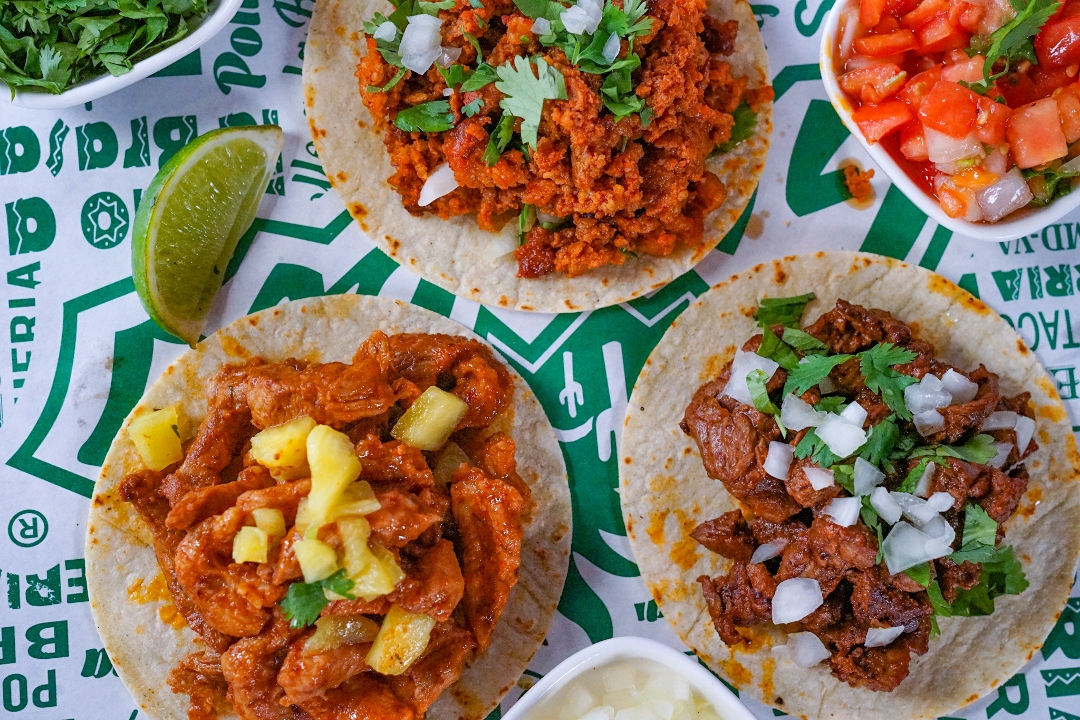 Corn tortilla filled with your choice of protein. topped with onions, cilantro, and salsa on the side.