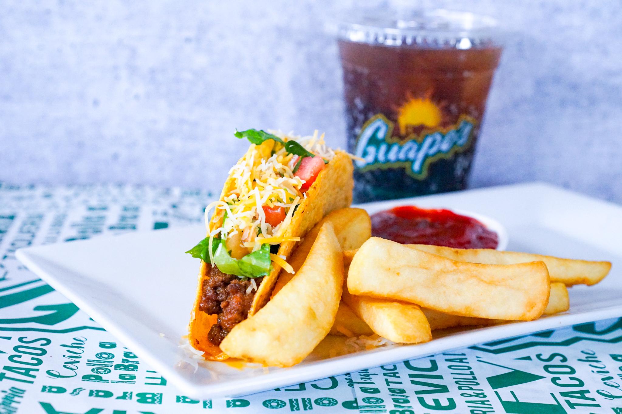 Hard-shell taco with beef or chicken. topped with lettuce, pico de gallo, and cheese. served with french fries and soda.