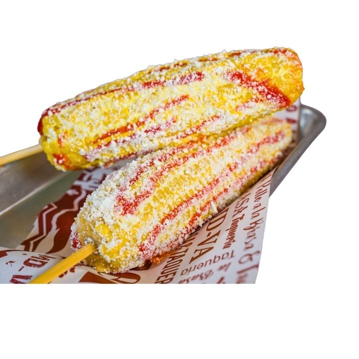 Broiled corn on the cob topped with mayonnaise, mustard, english sauce, and ketchup covered with cheese.