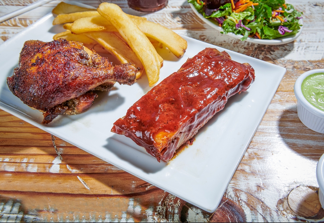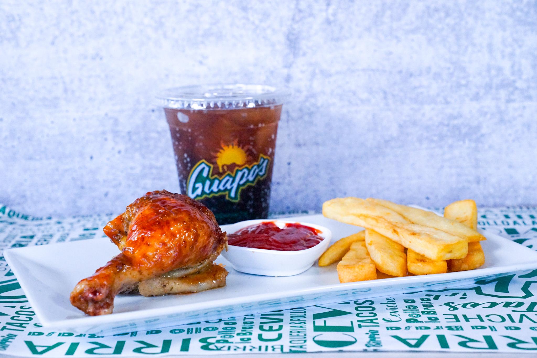 A 1/4 chicken with ribs or taco served with fries, salad and soda.