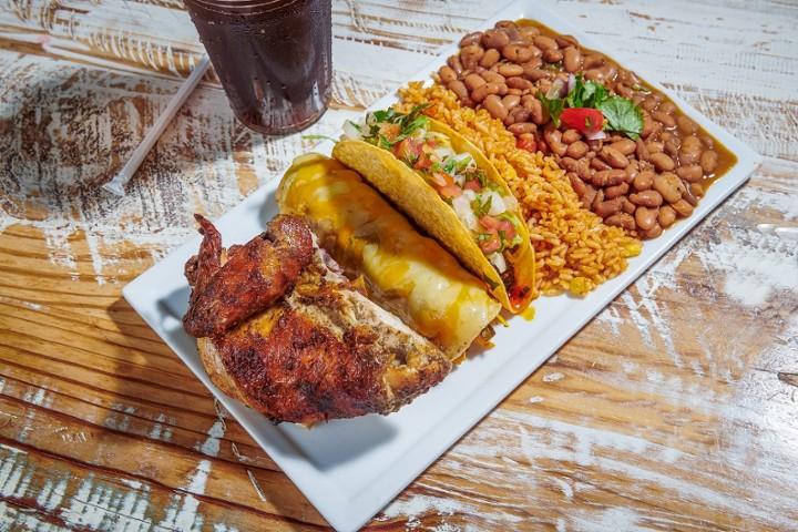 A 1/4 chicken served with a chicken enchilada and beef crispy taco served with rice and beans, sour cream and pico de gallo.