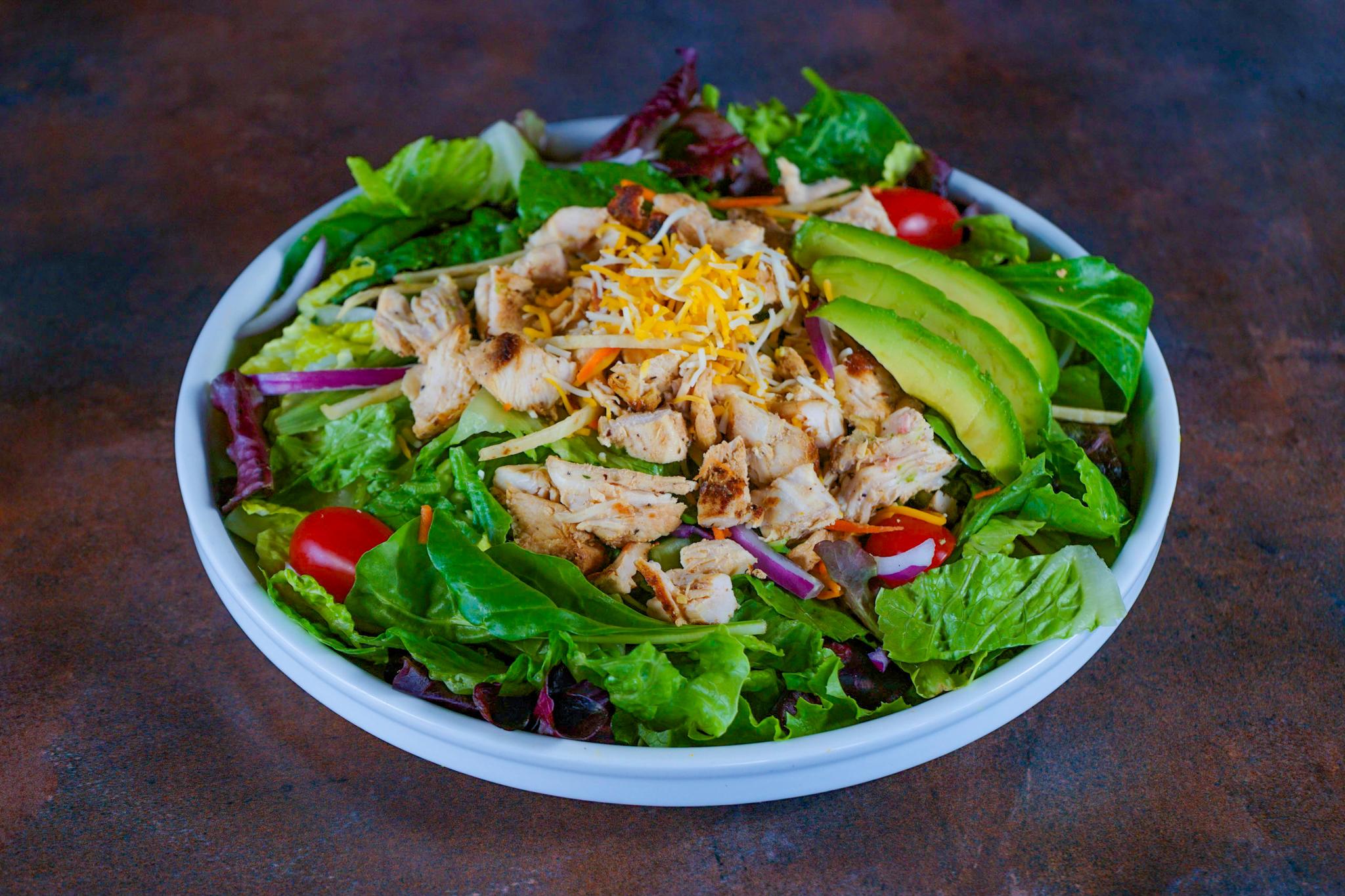 Flour tortilla shell filled with romaine lettuce, avocado, cherry tomatoes, red onions, refried beans, sour cream, cheese and your choice of protein. comes with yummy salad dressing on the side.